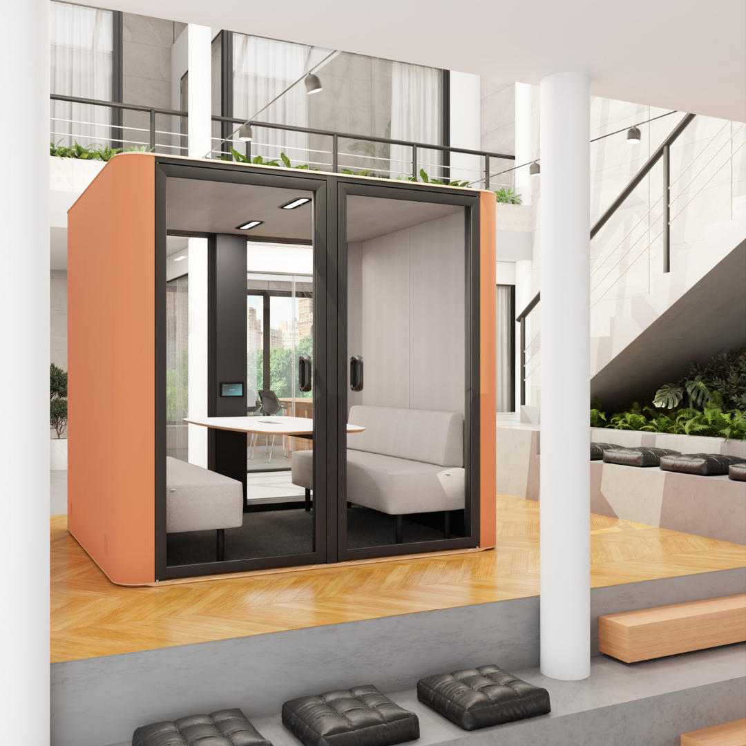 Perfect for 6-8 person with a comfortable, spacious feel. This Premium pod includes high tech features to aid employee focus.