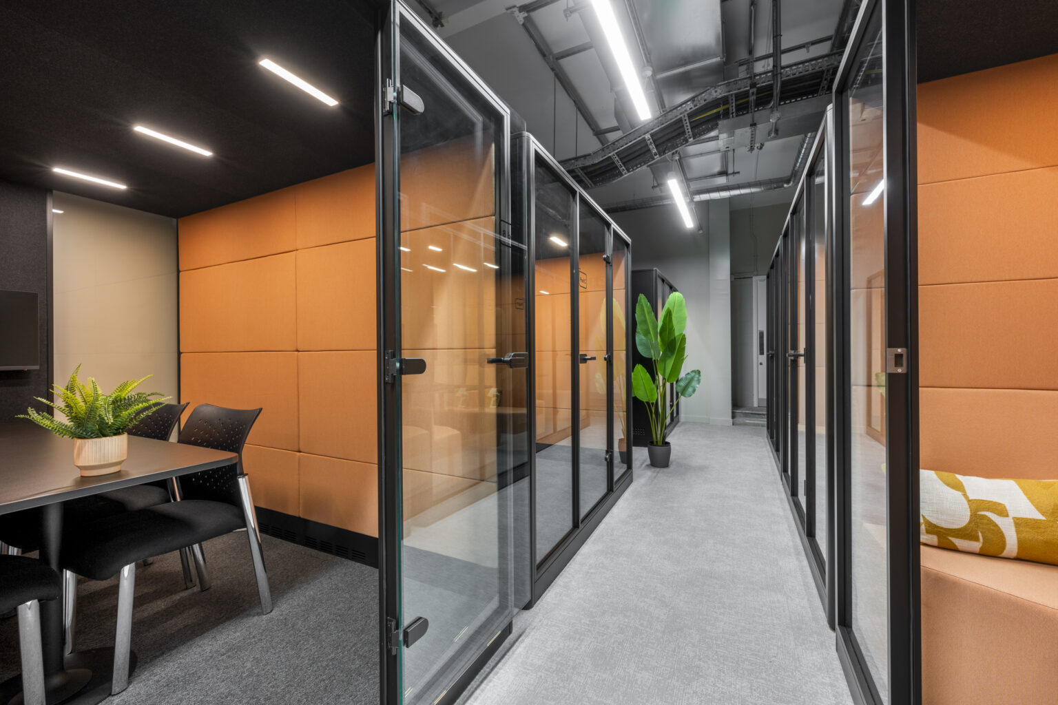 This project featured 9no. Calma 4 4-person meeting pods, 4no. Calma Pro 6-person meeting pods & 3no. Calma Z2 2-person Video pods, beautifully finished in Matte Black (PW9017) with a Camira Era Sequence (CSE25) fabric.